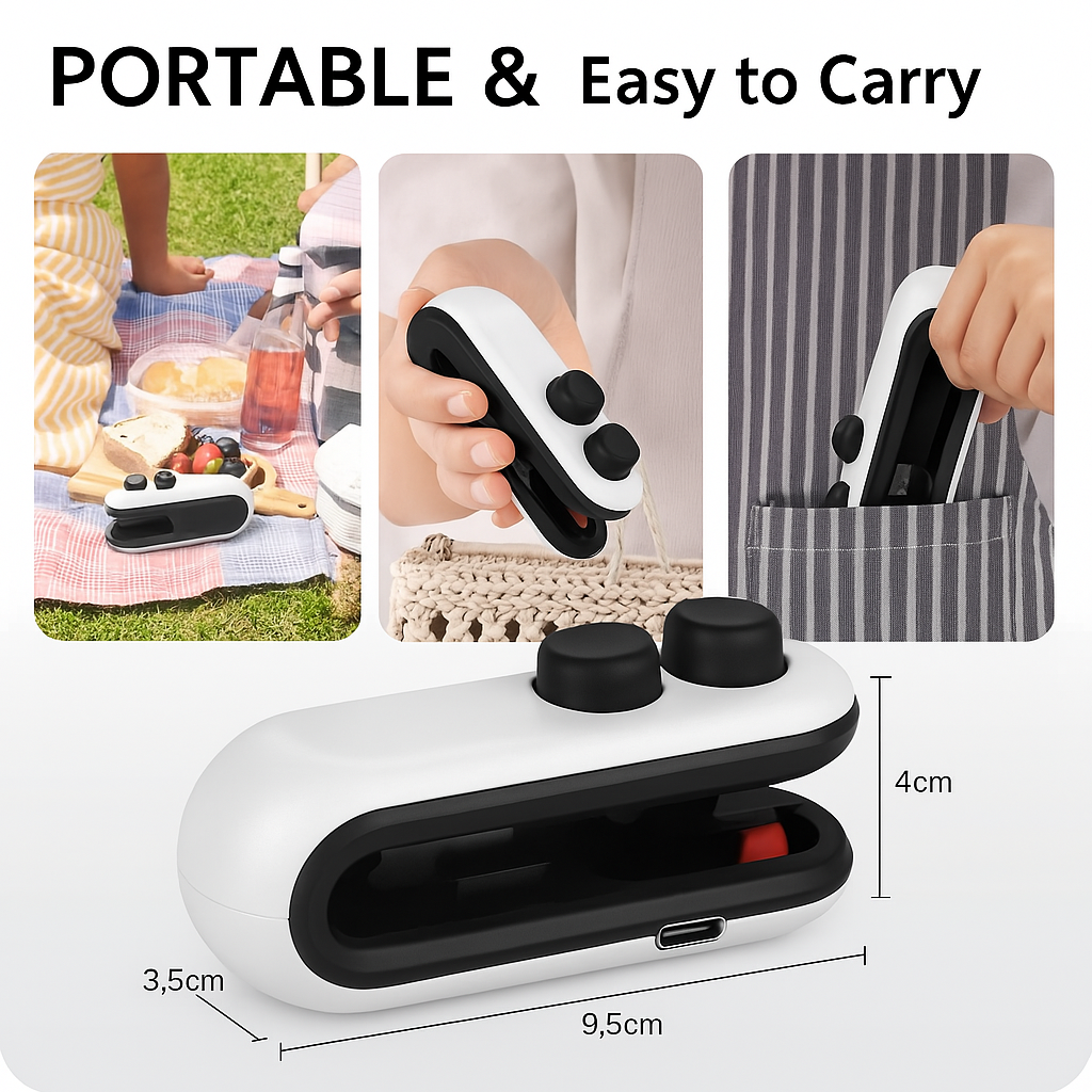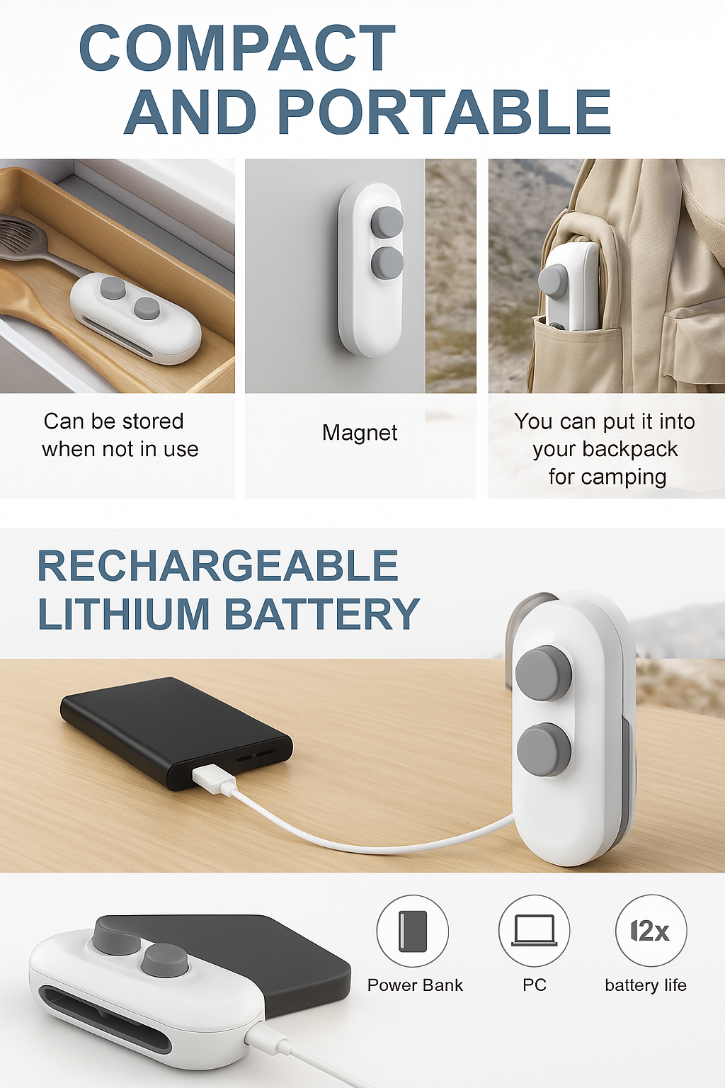 Weighing just 90 grams , the device is ultra-light and fits easily into drawers, handbags, or travel kits. Its magnetic back allows you to stick it to your fridge or any metal surface for easy access. Perfect for kitchens with limited space or for on-the-go sealing during travel, picnics, or camping.