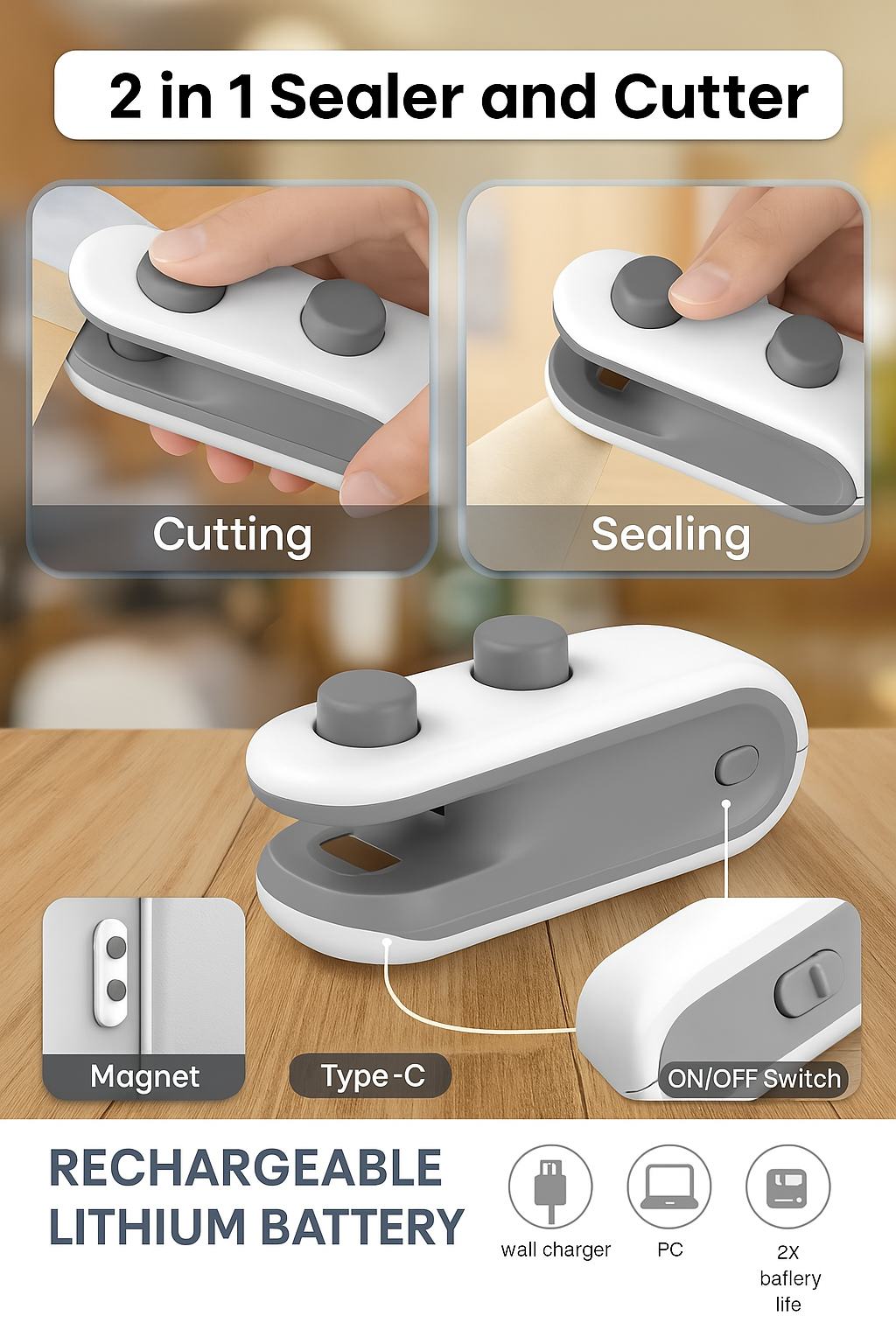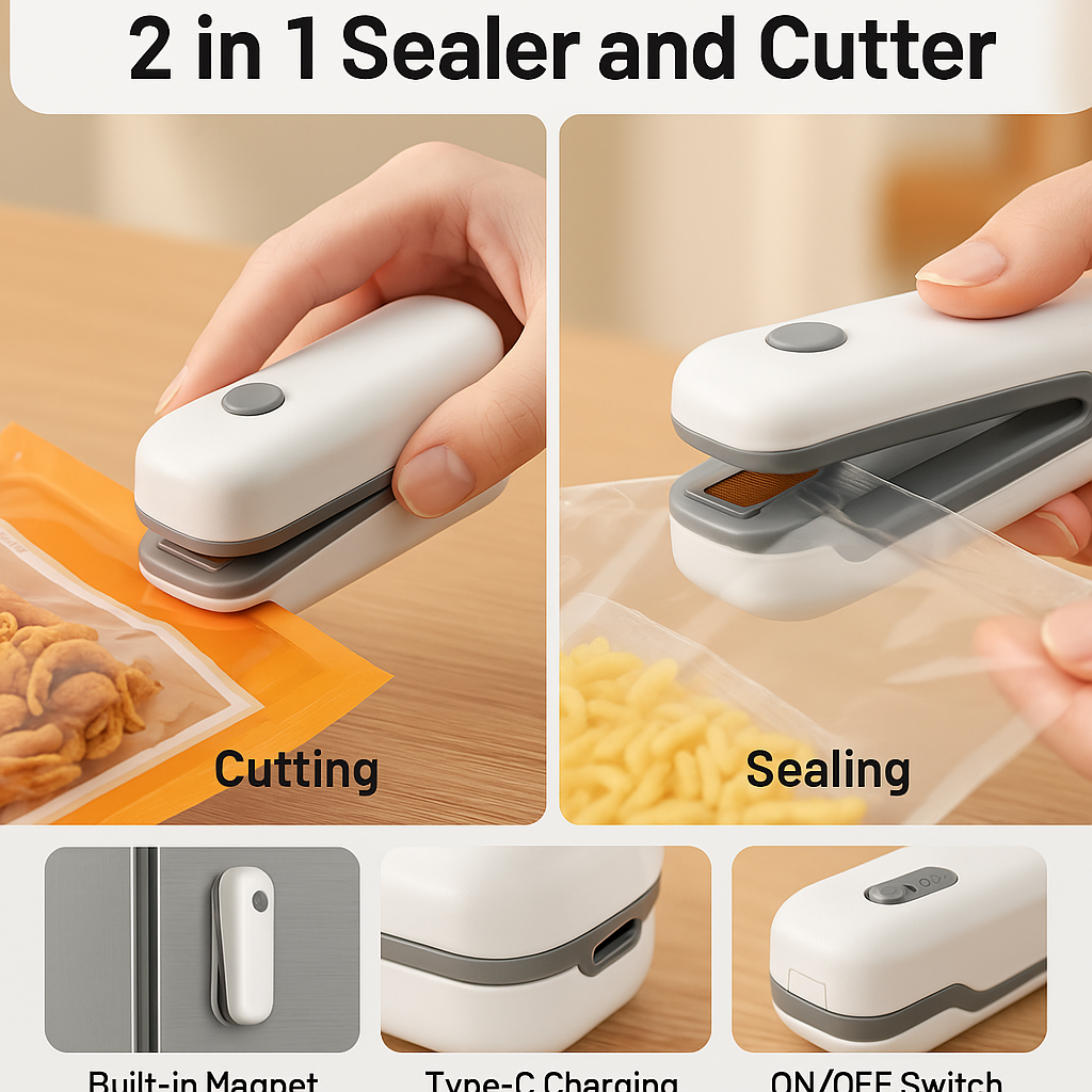 This compact device combines two essential tools in one—heat sealer and bag cutter. Whether you're resealing snacks or opening packages, it makes food preservation effortless and tidy. No need for scissors or clips—just seal and cut with one gadget. This design saves time and minimizes clutter in your kitchen or workspace.